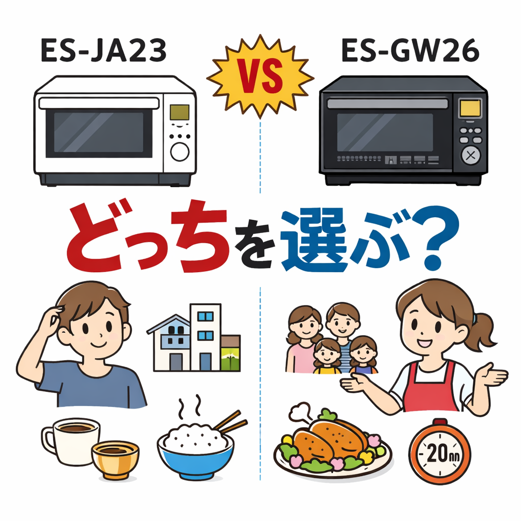 この記事では、オーブンレンジ初心者の方でもイメージしやすいように、実際の使い方や生活スタイルを交えながら、ES-JA23とES-GW26の違いと選び方をやさしく解説します。