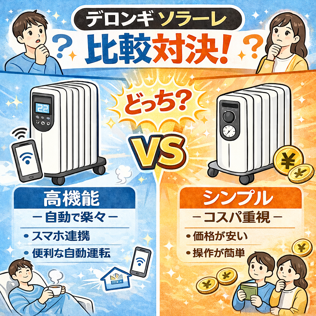どちらもデロンギらしいやさしい暖かさを感じられるモデルですが、細かい使い勝手や快適性の方向性が少しずつ異なります。