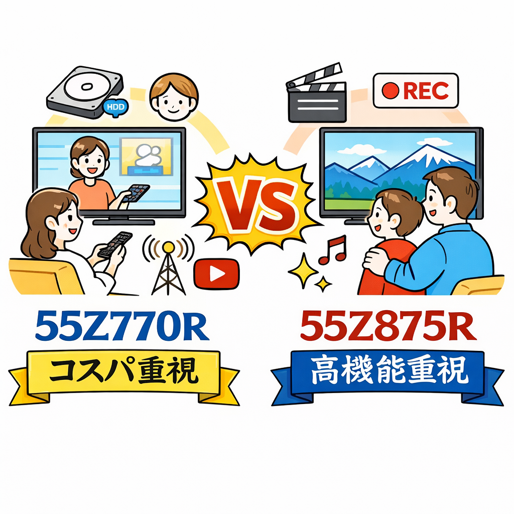 その中で、コストパフォーマンスを重視するなら55Z770R、画質や録画環境まで含めた総合性能を重視するなら55Z875Rという選び方が失敗しにくいでしょう。