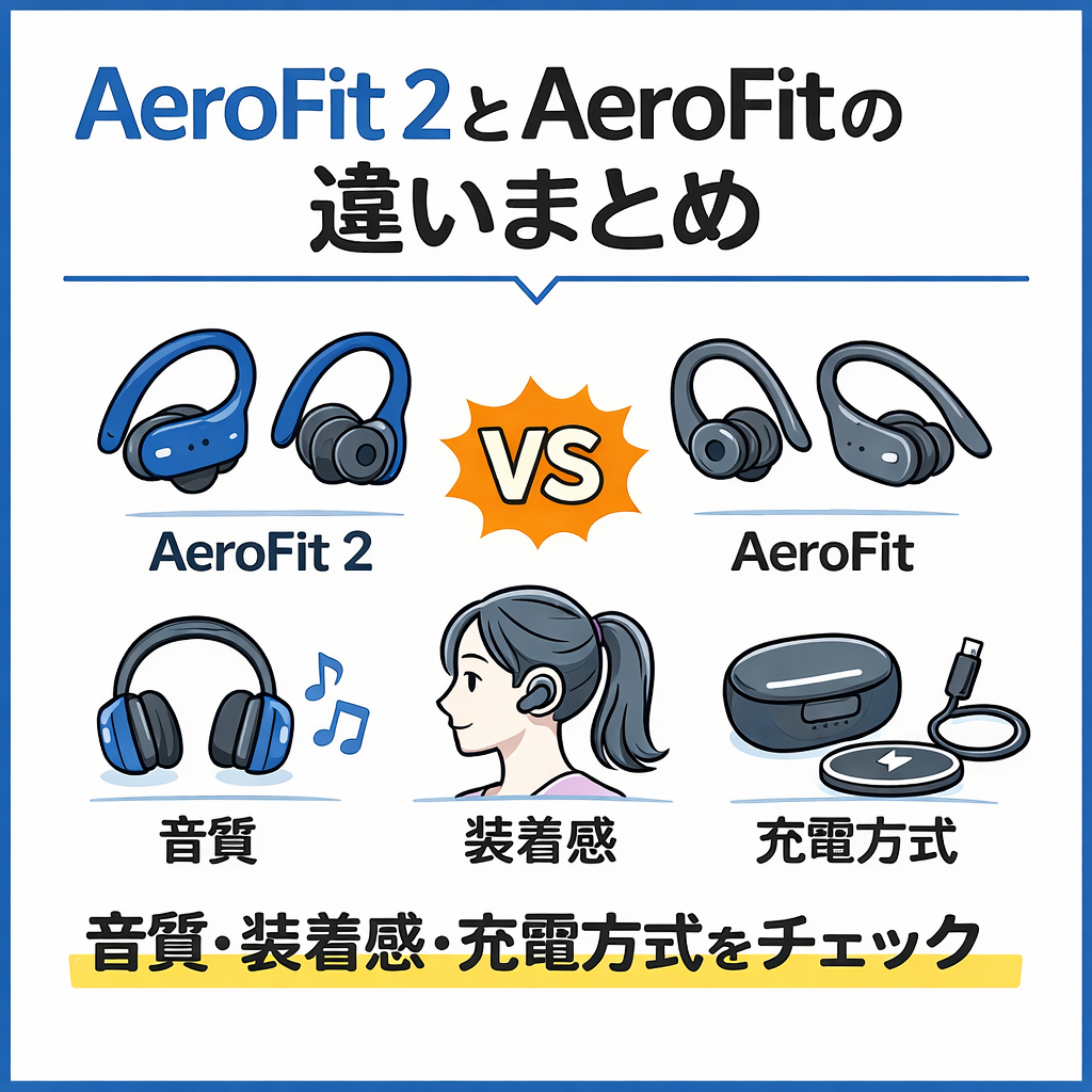 AeroFit 2とAeroFitの最大の違いは、音質・充電方式・アプリ機能といった使い勝手の進化にあります。