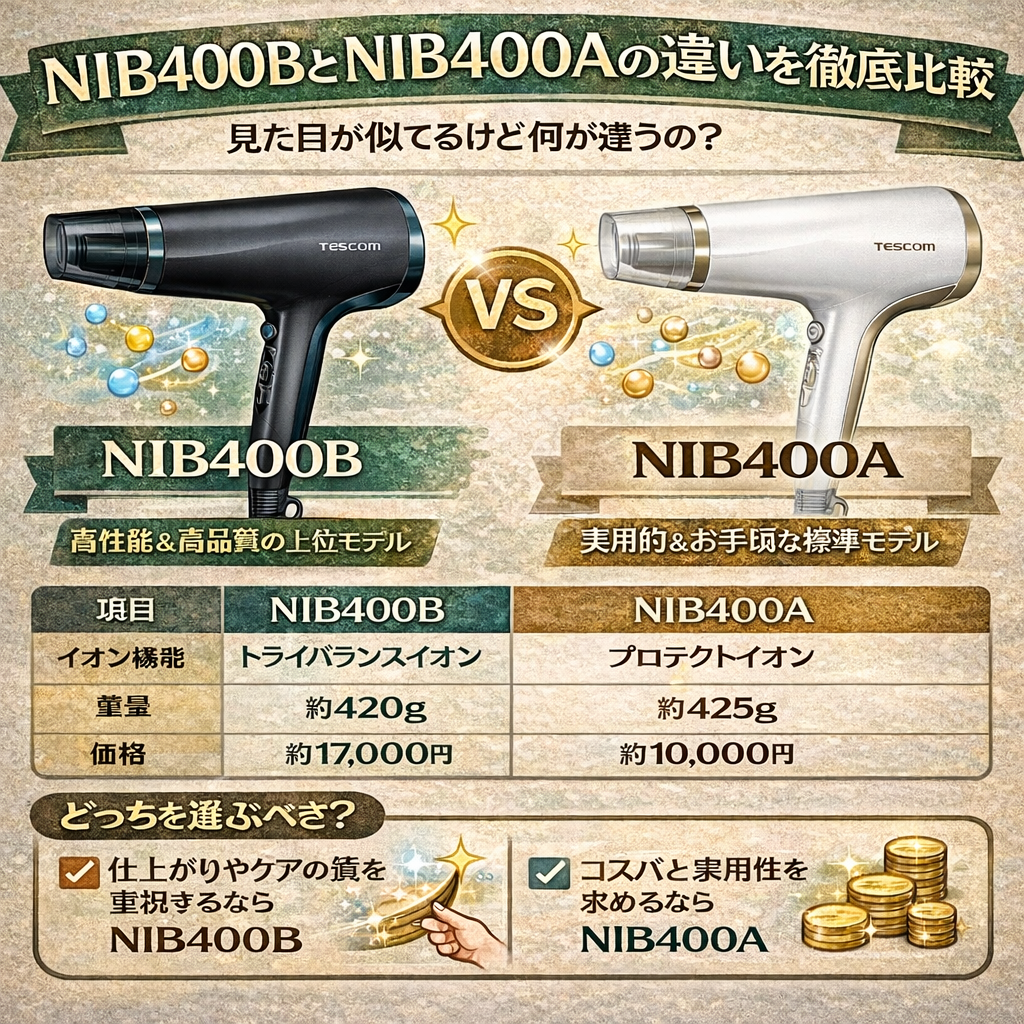 この価格差は、主に搭載されているイオン機能の違いから来ています。少しでも高性能な仕上がりを求める方にはNIB400Bが魅力的ですが、コストパフォーマンスを重視する方にはNIB400Aが適しています。