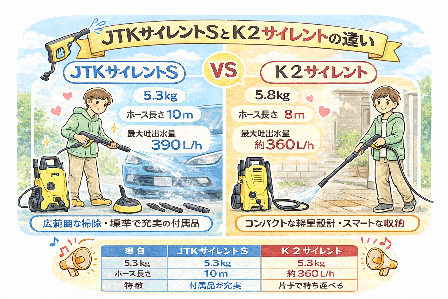 JTKサイレントSとK2サイレント、この二つの高圧洗浄機を選ぶ際にはどのようなポイントに注目すべきでしょうか。