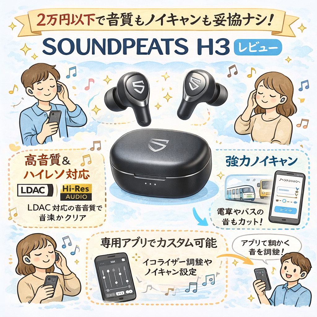 SOUNDPEATS H3は、音質やノイズキャンセリングを大切にしたい方にとって、非常に魅力的な選択です。特に、価格が1万円台でありながら、ハイレゾ対応という贅沢なスペックを持ちながら、日常生活での使いやすさも兼ね備えています。